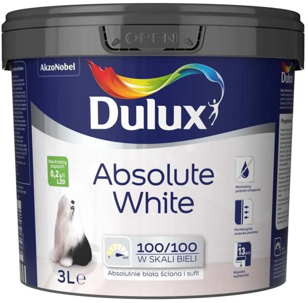 Dulux Absolute White fehér, beltéri falfesték 3 l. A Dulux Absolute White tökéletesen fehér (100/100* a fehér skálán) színt és mély matt felületet biztosít. A nagyon alacsony - 0,2 g/L - VOC tartalomnak köszönhetően semleges szagú. A festék tökéletesen eloszlik a fal felületén, optimalizált összetétele csepegésmentes, könnyű felhordást biztosít.