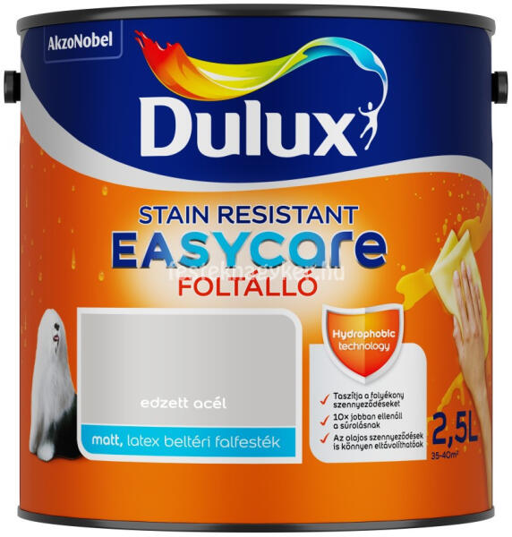 Foltálló és víztaszító: A Dulux EasyCare az első olyan beltéri színes falfesték, amely forradalmi víztaszító tulajdonságokkal rendelkezik. A festék egyedülálló összetételének köszönhetően a falról lepereg a víz és a legtöbb folyékony szennyeződés. Így nem szívódnak mélyen a bevonatba, és könnyen eltávolíthatók. Ha otthon gyerekek vagy háziállatok vannak, ez különösen hasznos lehet