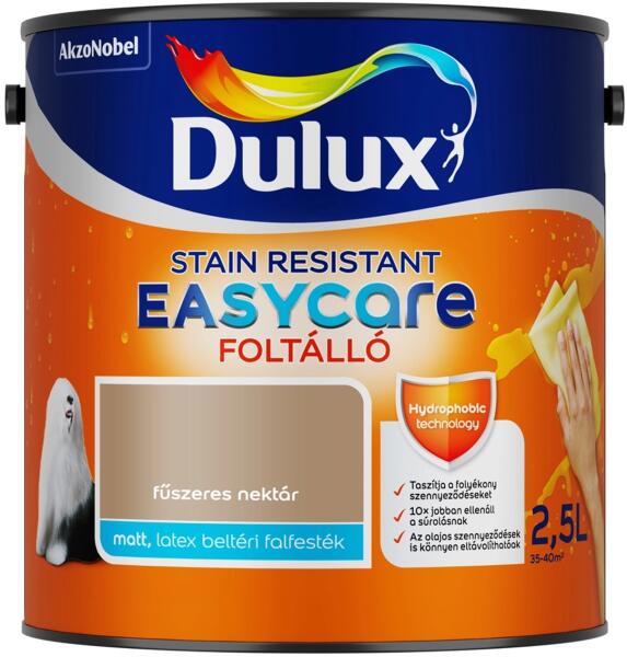 DZ Easycare Fűszeres Nektár 2,5 l. Forradalmi víztaszító tulajdonságú beltéri falfesték. A festék egyedülálló összetételének köszönhetően a falról lepereg a víz és a legtöbb folyékony szennyeződés, amelyek így nem hatolnak mélyen a bevonatba. Rendkívül ellenálló felületet hoz létre, amelyről gyerekjáték a kosz eltávolítása.