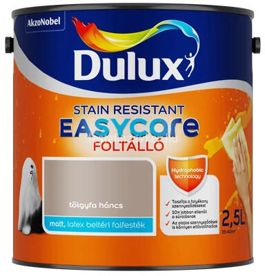 Foltálló és víztaszító: A Dulux EasyCare az első olyan beltéri színes falfesték, amely forradalmi víztaszító tulajdonságokkal rendelkezik. A festék egyedülálló összetételének köszönhetően a falról lepereg a víz és a legtöbb folyékony szennyeződés. Így nem szívódnak mélyen a bevonatba, és könnyen eltávolíthatók. Ha otthon gyerekek vagy háziállatok vannak, ez különösen hasznos lehet