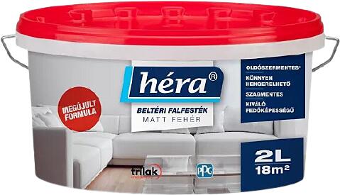 Héra Beltéri Falfesték Matt Fehér Kiváló fedőképességű, extra fehér, matt belső falfesték. Hozzáadott oldószert nem tartalmaz. - Vakolt, beton, gipszkarton és glettelt új építésű, belső falfelületek festésére keresel megoldást?- Régi, esetleg szennyezett, elhanyagolt falfelületek frissítését tervezed?A Héra belső falfesték amellett, hogy kiváló fedőképességű, matt, extra fehér, egyenletes struktúrájú felület kialakítására képes . Aquakolor színezőpaszta és festék hozzáadásával igény szerint színezhető.