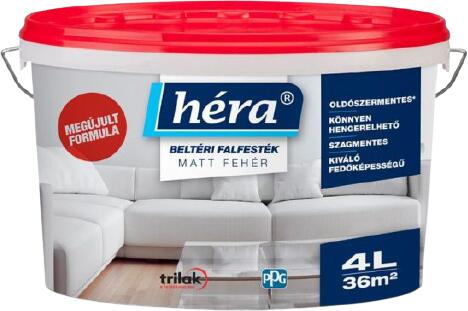 Héra Beltéri Falfesték Matt Fehér Kiváló fedőképességű, extra fehér, matt belső falfesték. Hozzáadott oldószert nem tartalmaz. - Vakolt, beton, gipszkarton és glettelt új építésű, belső falfelületek festésére keresel megoldást?- Régi, esetleg szennyezett, elhanyagolt falfelületek frissítését tervezed?A Héra belső falfesték amellett, hogy kiváló fedőképességű, matt, extra fehér, egyenletes struktúrájú felület kialakítására képes . Aquakolor színezőpaszta és festék hozzáadásával igény szerint színezhető.
