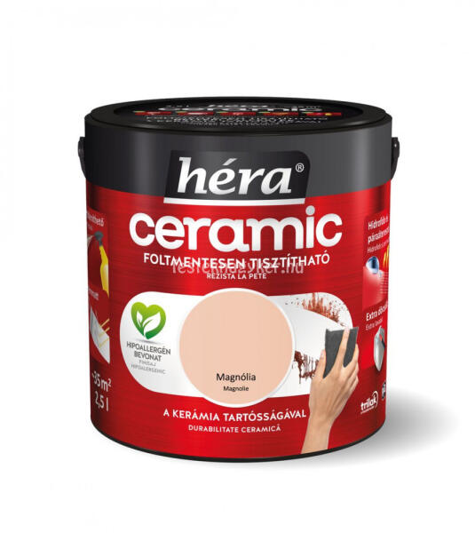 HÉRA CERAMIC extra dörzsálló beltéri falfesték. Hidrofób alkotóelemei vízlepergetővé teszik a bevonatot, ugyanakkor innovatív kötőanyagának köszönhetően kiváló páraáteresztő tulajdonságokkal rendelkezik.