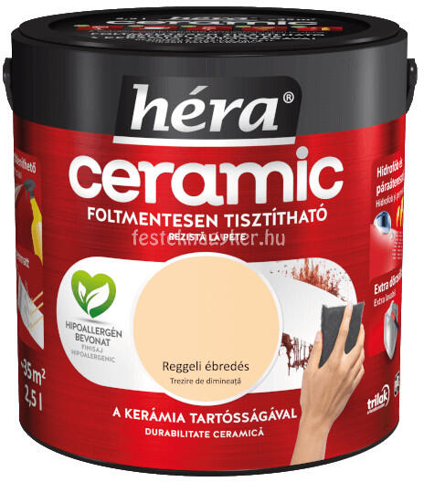 HÉRA CERAMIC extra dörzsálló beltéri falfesték. Hidrofób alkotóelemei vízlepergetővé teszik a bevonatot, ugyanakkor innovatív kötőanyagának köszönhetően kiváló páraáteresztő tulajdonságokkal rendelkezik.