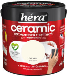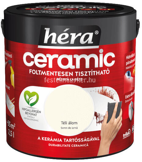 HÉRA CERAMIC extra dörzsálló beltéri falfesték. Hidrofób alkotóelemei vízlepergetővé teszik a bevonatot, ugyanakkor innovatív kötőanyagának köszönhetően kiváló páraáteresztő tulajdonságokkal rendelkezik.