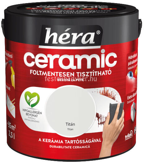 HÉRA CERAMIC extra dörzsálló beltéri falfesték. Hidrofób alkotóelemei vízlepergetővé teszik a bevonatot, ugyanakkor innovatív kötőanyagának köszönhetően kiváló páraáteresztő tulajdonságokkal rendelkezik.
