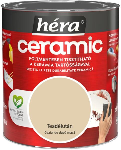 A Héra Ceramic speciális mikrokerámia-gyöngy tartalmának köszönhetően a legellenállóbb Héra beltéri falfesték. A kerámia technológia kimagasló mosás- és dörzsállóságot biztosít a felületnek, így téve azt foltmentesen tisztíthatóvá és fertőtleníthetővé. A Héra Ceramic falfesték hidrofób alkotórészei révén vízlepergető bevonatot képez, miközben innovatív kötőanyag szerkezete kiváló páraáteresztő tulajdonságot biztosít. A hipoallergén, selyemmatt felület exkluzív színmegjelenést kölcsönöz otthonának.