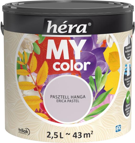 Kiváló minőségű, tartós matt festék beltéri falfelületek festésére. A Héra MyColor beltéri matt falfesték kiváló fedőképességű, mosható, pára- és legáteresztő bevonatot képez, színei pedig élénkek és tartósak. Egyszerű használatának és illatosított formulájának köszönhetően széles körben alkalmazható. Kiemelkedő fedőképesség Páraáteresztő Divatos színárnyalatok Illatosított