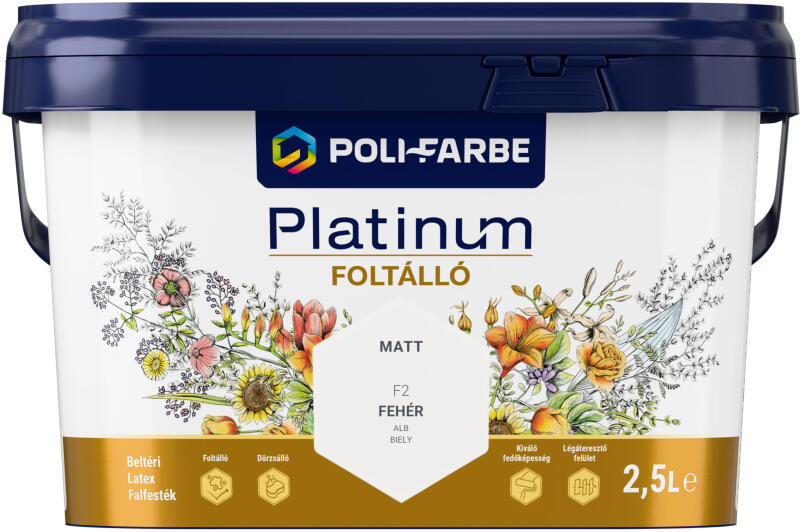 Alkalmazás:   A festék cement, mész-cement, gipszhabarcs, tégla, gipszkarton, glettelt, festhető tapétával bevont, valamint diszperziós festékkel festett beltéri falak és mennyezetek dekoratív és védőfestésére szolgál. Kiadósság :  akár 14m2/l egy rétegben. Felhordás:   két rétegben, ecset, henger (13-19 mm szálhosszúságú festőhenger) vagy szórás segítségével. )Átfesthetőség : 2-4 óra. FELHASZNÁLÁS:  A festéket felhasználás előtt gondosan fel kell keverni. A felületnek megfelelő szilárdságúnak, száraznak, tisztának, por-, olaj- és zsírmentesnek kell lennie. Az új, még festetlen mész-, mészcement falfelületen az érdes részeket, repedéseket finomglettel kell elsimítani, csiszolni, portalanítani. A régi bevonatoknál a laza, leváló részeket kaparással, csiszolással el kell távolítani és a falfelületet finomglettel szükséges kijavítani. Ha a korábbi bevonat szilárd, de erősen szennyezett, akkor a felületet vízzel és festőszappannal (mosószerrel) kell megtisztítani, hogy a réteg feloldódjon. A megfelelően előkészített felületet Poli-Farbe Platinum diszperziós mélyalapozóval alapozza. A beázás, nikotin, olaj stb. okozta foltokat az ilyen felületekre tervezett Poli-Farbe izoláló festékkel kell lefesteni. Az üvegszálas tapétákat közvetlenül a festékkel kell lefesteni, vagy ha a gyártó ajánlása ettől eltérő, akkor aszerint javasolt eljárni. Vigye fel a hígítatlan festéket az alapozott felületre. Ha a felhordás módja szükségessé teszi, (nagyon nedvszívó felület első rétege) max. 10%-ban vízzel hígítható. Nem keverhető más festékkel vagy mésszel. FELHORDÁS:  két rétegben, ecset, henger (13-19 mm szálhosszúságú festőhenger) vagy szórás segítségével. ÁTFESTHETŐSÉG:  2-4 óra. Alaposan és egyenletesen kell felvinni ugyanazt a mennyiségű festéket minden egységnyi fal-vagy mennyezetfelületre. Az utolsó gurításokat a hengerrel egy irányban kell végezni. A festékréteg 28 nappal a festési munkálatok elvégzése után nyeri el teljes tartósságát. A különböző gyártási tételekből származó termékeket össze kell homogenizálni. A festési munkálatokat a felület és a környezet 10-30°C közötti hőmérséklet tartományban végezze. Az eszközöket vízzel lehet elmosni. KIADÓSSÁG:  akár 14m2/l egy rétegben. A gyakorlati kiadósság több tényezőtől függ: a felület típusától, a szívóképességétől, szerkezetétől, színétől, valamint az alkalmazott eszköz típusától és az alkalmazás módjától. A szavatossági idő és a sarzsszám a csomagoláson található.