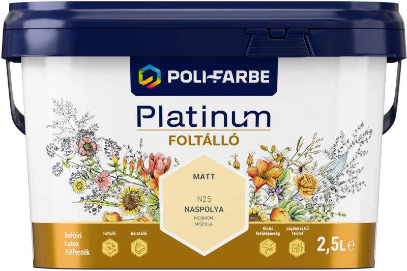 Alkalmazás:   A festék cement, mész-cement, gipszhabarcs, tégla, gipszkarton, glettelt, festhető tapétával bevont, valamint diszperziós festékkel festett beltéri falak és mennyezetek dekoratív és védőfestésére szolgál. Kiadósság :  akár 14m2/l egy rétegben. Felhordás:   két rétegben, ecset, henger (13-19 mm szálhosszúságú festőhenger) vagy szórás segítségével. )Átfesthetőség : 2-4 óra. FELHASZNÁLÁS:  A festéket felhasználás előtt gondosan fel kell keverni. A felületnek megfelelő szilárdságúnak, száraznak, tisztának, por-, olaj- és zsírmentesnek kell lennie. Az új, még festetlen mész-, mészcement falfelületen az érdes részeket, repedéseket finomglettel kell elsimítani, csiszolni, portalanítani. A régi bevonatoknál a laza, leváló részeket kaparással, csiszolással el kell távolítani és a falfelületet finomglettel szükséges kijavítani. Ha a korábbi bevonat szilárd, de erősen szennyezett, akkor a felületet vízzel és festőszappannal (mosószerrel) kell megtisztítani, hogy a réteg feloldódjon. A megfelelően előkészített felületet Poli-Farbe Platinum diszperziós mélyalapozóval alapozza. A beázás, nikotin, olaj stb. okozta foltokat az ilyen felületekre tervezett Poli-Farbe izoláló festékkel kell lefesteni. Az üvegszálas tapétákat közvetlenül a festékkel kell lefesteni, vagy ha a gyártó ajánlása ettől eltérő, akkor aszerint javasolt eljárni. Vigye fel a hígítatlan festéket az alapozott felületre. Ha a felhordás módja szükségessé teszi, (nagyon nedvszívó felület első rétege) max. 10%-ban vízzel hígítható. Nem keverhető más festékkel vagy mésszel. FELHORDÁS:  két rétegben, ecset, henger (13-19 mm szálhosszúságú festőhenger) vagy szórás segítségével. ÁTFESTHETŐSÉG:  2-4 óra. Alaposan és egyenletesen kell felvinni ugyanazt a mennyiségű festéket minden egységnyi fal-vagy mennyezetfelületre. Az utolsó gurításokat a hengerrel egy irányban kell végezni. A festékréteg 28 nappal a festési munkálatok elvégzése után nyeri el teljes tartósságát. A különböző gyártási tételekből származó termékeket össze kell homogenizálni. A festési munkálatokat a felület és a környezet 10-30°C közötti hőmérséklet tartományban végezze. Az eszközöket vízzel lehet elmosni. KIADÓSSÁG:  akár 14m2/l egy rétegben. A gyakorlati kiadósság több tényezőtől függ: a felület típusától, a szívóképességétől, szerkezetétől, színétől, valamint az alkalmazott eszköz típusától és az alkalmazás módjától. A szavatossági idő és a sarzsszám a csomagoláson található.