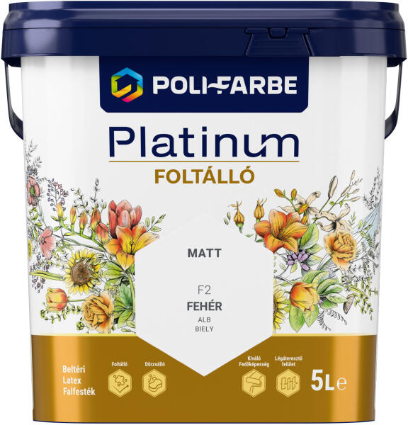 Alkalmazás:   A festék cement, mész-cement, gipszhabarcs, tégla, gipszkarton, glettelt, festhető tapétával bevont, valamint diszperziós festékkel festett beltéri falak és mennyezetek dekoratív és védőfestésére szolgál. Kiadósság :  akár 14m2/l egy rétegben. Felhordás:   két rétegben, ecset, henger (13-19 mm szálhosszúságú festőhenger) vagy szórás segítségével. )Átfesthetőség : 2-4 óra. FELHASZNÁLÁS:  A festéket felhasználás előtt gondosan fel kell keverni. A felületnek megfelelő szilárdságúnak, száraznak, tisztának, por-, olaj- és zsírmentesnek kell lennie. Az új, még festetlen mész-, mészcement falfelületen az érdes részeket, repedéseket finomglettel kell elsimítani, csiszolni, portalanítani. A régi bevonatoknál a laza, leváló részeket kaparással, csiszolással el kell távolítani és a falfelületet finomglettel szükséges kijavítani. Ha a korábbi bevonat szilárd, de erősen szennyezett, akkor a felületet vízzel és festőszappannal (mosószerrel) kell megtisztítani, hogy a réteg feloldódjon. A megfelelően előkészített felületet Poli-Farbe Platinum diszperziós mélyalapozóval alapozza. A beázás, nikotin, olaj stb. okozta foltokat az ilyen felületekre tervezett Poli-Farbe izoláló festékkel kell lefesteni. Az üvegszálas tapétákat közvetlenül a festékkel kell lefesteni, vagy ha a gyártó ajánlása ettől eltérő, akkor aszerint javasolt eljárni. Vigye fel a hígítatlan festéket az alapozott felületre. Ha a felhordás módja szükségessé teszi, (nagyon nedvszívó felület első rétege) max. 10%-ban vízzel hígítható. Nem keverhető más festékkel vagy mésszel. FELHORDÁS:  két rétegben, ecset, henger (13-19 mm szálhosszúságú festőhenger) vagy szórás segítségével. ÁTFESTHETŐSÉG:  2-4 óra. Alaposan és egyenletesen kell felvinni ugyanazt a mennyiségű festéket minden egységnyi fal-vagy mennyezetfelületre. Az utolsó gurításokat a hengerrel egy irányban kell végezni. A festékréteg 28 nappal a festési munkálatok elvégzése után nyeri el teljes tartósságát. A különböző gyártási tételekből származó termékeket össze kell homogenizálni. A festési munkálatokat a felület és a környezet 10-30°C közötti hőmérséklet tartományban végezze. Az eszközöket vízzel lehet elmosni. KIADÓSSÁG:  akár 14m2/l egy rétegben. A gyakorlati kiadósság több tényezőtől függ: a felület típusától, a szívóképességétől, szerkezetétől, színétől, valamint az alkalmazott eszköz típusától és az alkalmazás módjától. A szavatossági idő és a sarzsszám a csomagoláson található.