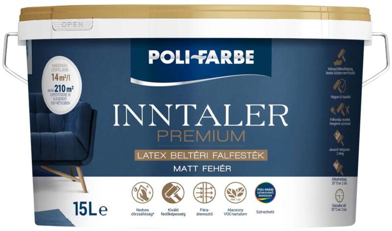 Inntaler Premium beltéri diszperziós falfesték fehér 15 l. Kiváló fedőképességű, vízzel hígítható, illatosított beltéri falfesték. Bevonata matt, esztétikus, jó pára-és légáteresztő. Kiszerelése: 15 l.