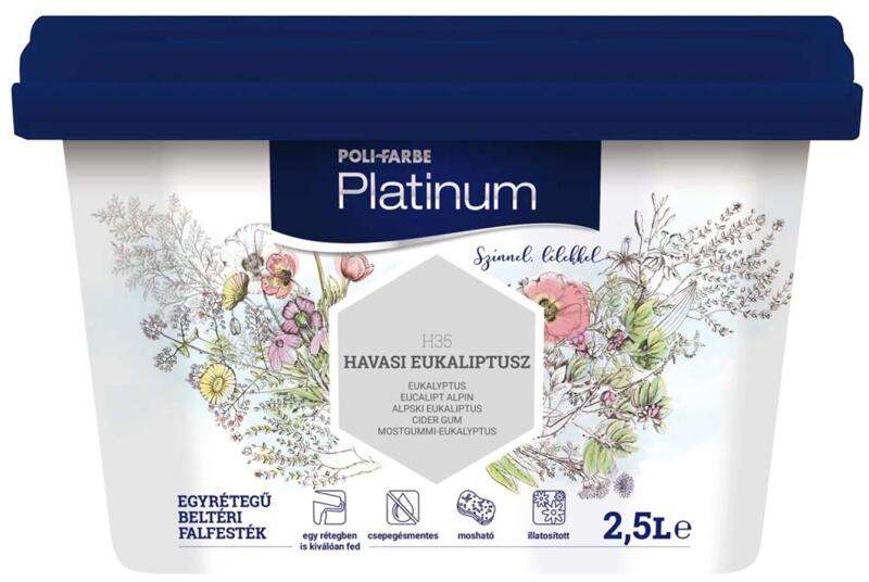 Poli-Farbe Platinum beltéri diszperziós falfesték Havasi eukaliptusz 2,5 l. Extra nagy fedőképességű, akár egy rétegben is. Gélesített, csepegésmentes. Bevonata matt, tartós, könnyen tisztítható. Kiszerelés: 2,5 l.