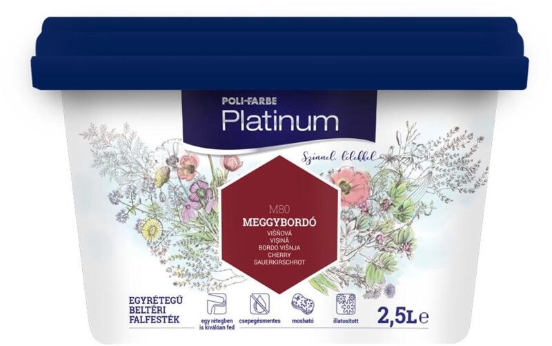 Meggybordó színű, 2,5 l-es Platinum beltéri falfesték újonnan vakolt felületek, régi, festett felületek, valamint gipszkarton és tapéta felületkezeléséhez. Tartós, matt bevonatot képez és egyszerűen tisztítható. Szükség esetén max. 10 %-ban vízzel higítható.