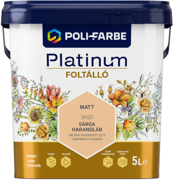 Poli-Farbe Platinum Foltálló Sárga harangláb SH20 5l beltéri latex falfesték Kiváló fedőképességű, dörzsálló, légáteresztő felületű beltéri latex falfesték. Az egyedülálló ULTRA HD COLOUR TECHNOLOGY kiemeli a színek kivételes mélységét.