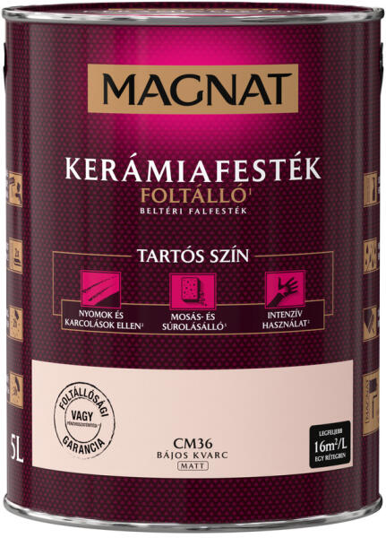 Magnat Kerámiafesték foltálló beltéri matt Magnat Kerámiafesték, mely ellenáll nyomoknak és karcolásoknak, lemosásnak és súrolásnak, és az intenzív használatnak.