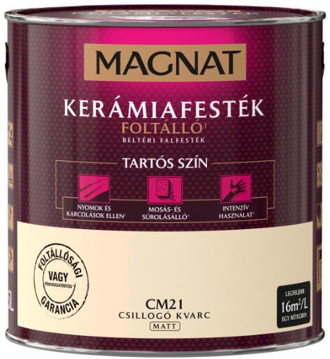 Magnat Kerámiafesték foltálló beltéri matt Magnat Kerámiafesték, mely ellenáll nyomoknak és karcolásoknak, lemosásnak és súrolásnak, és az intenzív használatnak.