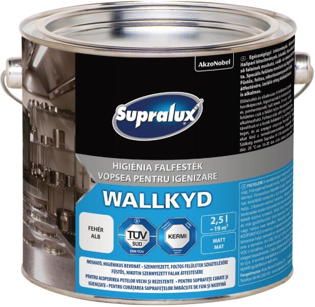 A Supralux Wallkyd higiéniai falfesték egészségügyi intézmények, élelmiszer- és italipari épületek, iskolák, lépcsőházak mosható, védő és dekoratív bevonata. Specális felülete révén teljesen higiénikus. Foltos, nikotin által szennyezett falak átfestésére, izoláló réteg kialakítására is alkalmas.