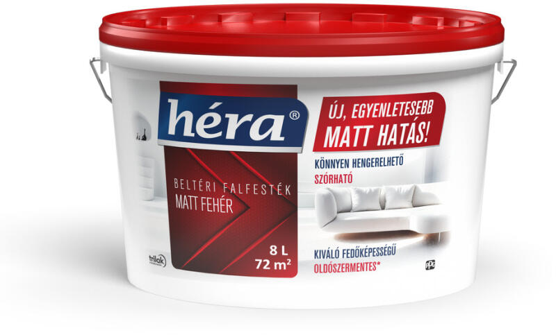 Héra Fehér Beltéri falfesték: Tökéletes fehérség, könnyű felhordás, és tartós védelem minden falra A tökéletesen fehér felületet képző Héra Beltéri falfesték egyedi összetétele lehetővé teszi, hogy poliamid festőhengerrel történtő felhordásakor a legoptimálisabb festékmennyiség kerüljön a falakra. A hozzáadott oldószert nem tartalmaz ó, szagmentes és könnyen hengerelhető festék két rétegben kiváló fedés t biztosít, továbbá pára- és légáteresztő felületet képez. Héra Színezőpasztákkal bármilyen pasztellárnyalatra egyszerűen színezhető.