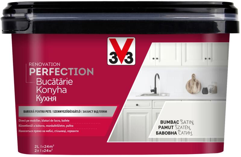 V33 Renovation Perfection vizes bázisú konyhai felújító festék, pamut színben, 2l kiszerelésben. Kiváló minőségű felújító festék belső terekbe. Használható nyers, lakkozott és festett fából készült konyhabútorokon és bútorlapokon, munkalapon, falicsempéken és háztartási gépeken. Munkalapoknál a festéket be kell vonni munkalap lakkal. Tulajdonságok - Közvetlenül a felületre: nincs szükség a régi bevonatok eltávolítására, alapozásra. - Ellenálló a konyhai szennyeződésekkel szembe: pl. forró és hideg zsírok, bor, paradicsomszósz, kávé, tea. - Ellenáll az enyhe tisztítószereknek: mosogatószer, általános tisztítószerek. - Ellenáll a gyakori mosásnak. A termék jellemzői A festék 20 nap után nyeri el teljes ellenálló képességét, addig védje a felületet a sérülésektől. Száradási idő: a rétegek között 6 óra. Kiadósság egyszeri felhordásnál: 12m2/l. Alkalmazható a következő felületeken: kerámia, üveg, fa, bútorlap
