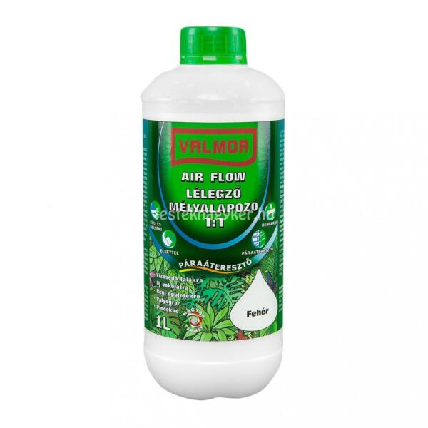 Alkalmazás: A VALMOR AIR FLOW Lélegző Mélyalapozó 1:1 oldószermentes, külés beltérben használható, kimagaslóan magas páraáteresztő képességgel rendelkező, környezetbarát termék. Nedvszívó felületek alapozására ajánljuk, ahol a felület „lélegzése fontos szempont. A VALMOR AIR FLOW Lélegző Beltéri Falfesték felhordása előtt a használata kifejezetten javasolt. Alkalmas minden ásványi eredetű felületre: szárító- felújító vakolatrendszerekre, normál vakolatra, gipszkartonra, mész-cement alapú felület simító anyagokra, valamint meszelt és nedvszívó képességgel bíró festett felületekre. Alkalmazása során a port leköti, behatol a felület pórusaiba, így erős tapadóképes alapfelületet biztosít. Használatával megelőzhető a felületek esetleges festési foltosodása.